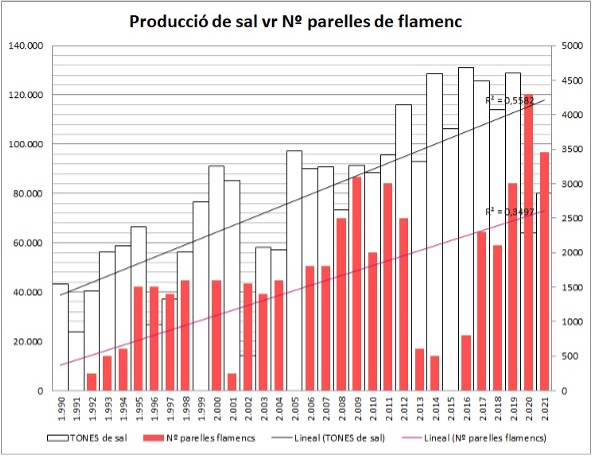 Los flamencos solían reproducirse en la antigüedad en el Delta del Ebro y debido a la falta de conservación y probablemente las condiciones de muchos humedales, hicieron que dejaran de hacerlo. Afortunadamente esta no es la situación en los últimos tiempos. He añadido un gráfico con la población de flamencos que anidan en el Delta del Ebro con datos de Infosa (empresa productora de sal) y del parque natural del Delta del Ebro (número de parejas que anidan en nuestras salinas). En rosa, tienen la situación actual de la po blación nidificante de flamenco en las salinas de Trinitat, año a año, con una tendencia positiva de R²=0’34. La anidación ha sido confiable y abundante todos los años excepto 1999, 2005, 2013, 2014, 2015, 2016. En esas primaveras y veranos hubo eventos de depredación por parte de las gaviotas patiamarillas y algunas condiciones climáticas adversas, haciendo imposible o muy difícil la cría. Para mostrar la importancia de las salinas y la producción de salmueras (agua salada) he añadido las barras blancas, mostrando la producción de sal con una mejora de nuestro sistema de salmueras y consecuentemente la producción de sal. Existe una correlación entre la tendencia de los flamencos y la producción de sal. En las salmueras vive un crustáceo llamado artemia (Artemia spp) y enormes cantidades de otros invertebrados, fuente de alimento para los flamencos y otras aves.